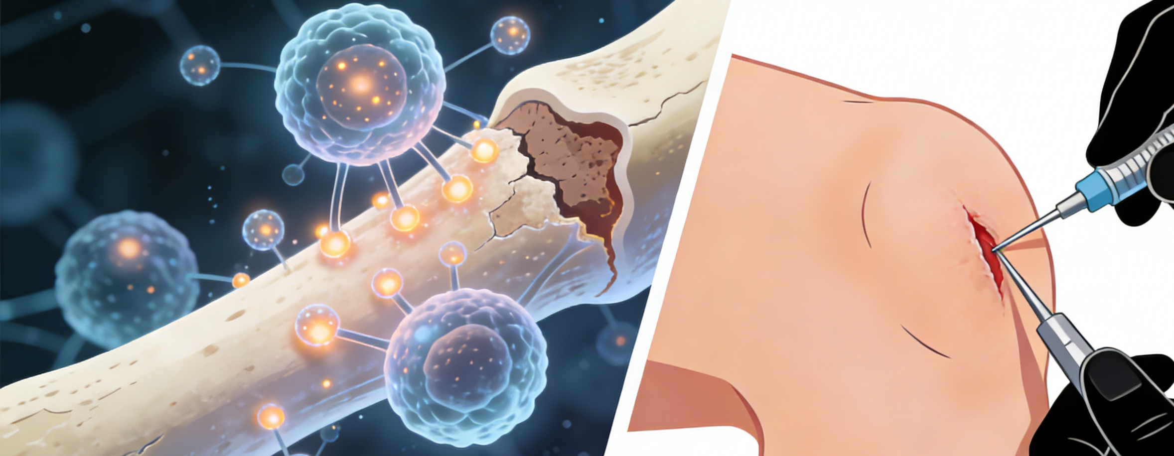 - • 骨を直接修復: 壊死した部分や傷んだ病変に対し、成長因子、iPSエクソソームと人工骨などを直接注入し、骨の再生を強力にバックアップします。
