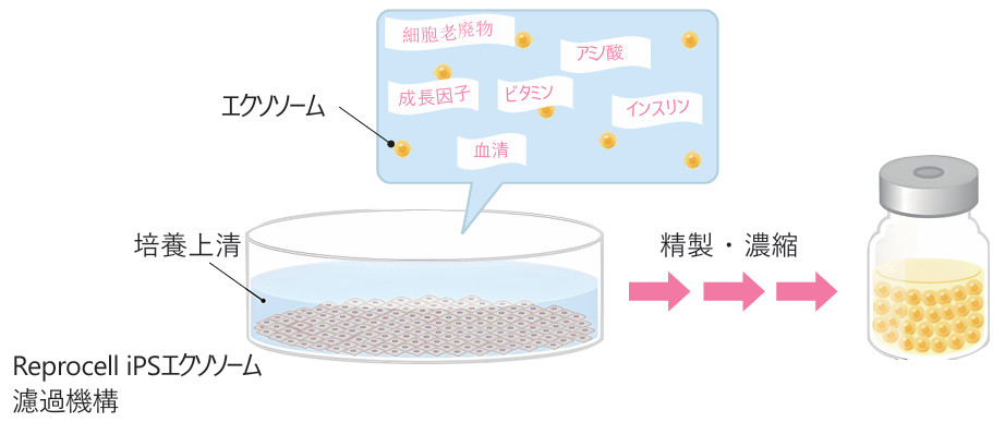 iPS細胞(人工多能性幹細胞)は、体の細胞の時間を巻き戻し、初期胚レベルに若返らせた(リプログラミングした)細胞です。iPS細胞エクソソームは、このiPS細胞から製造されたエクソソームです。