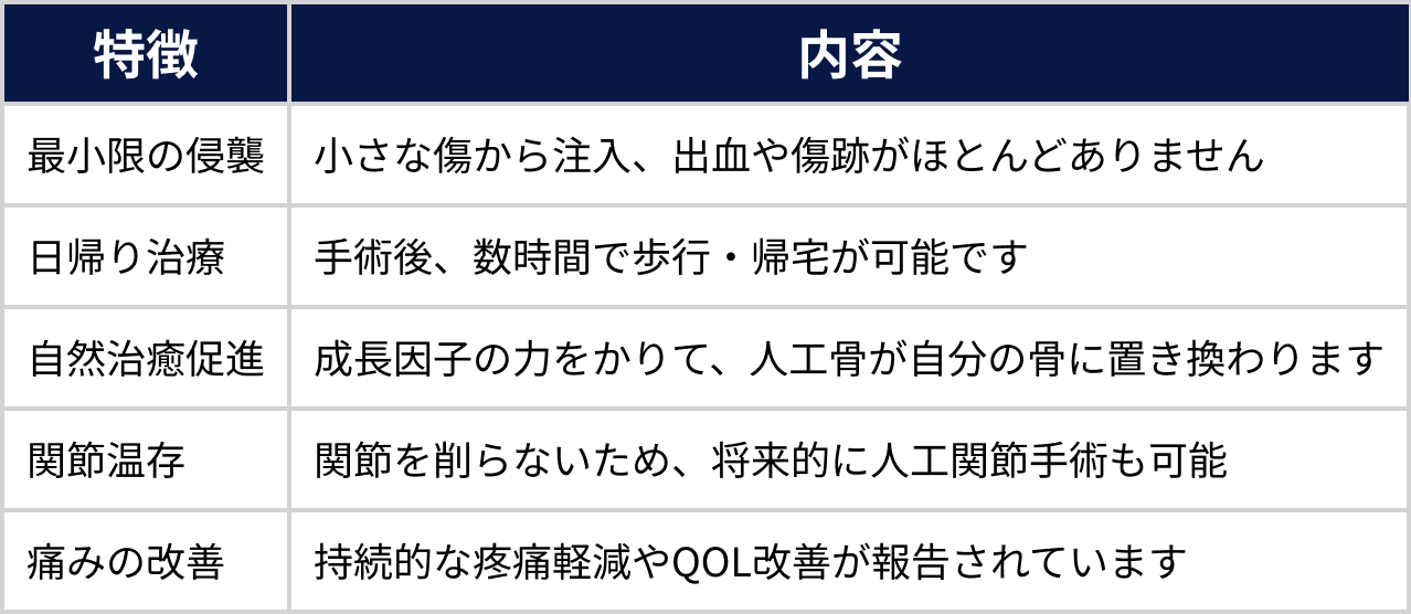この治療はBMLに対して「関節の土台となる骨そのもの」を修復することで、慢性的な関節痛の原因を根本から改善することを目的としています。