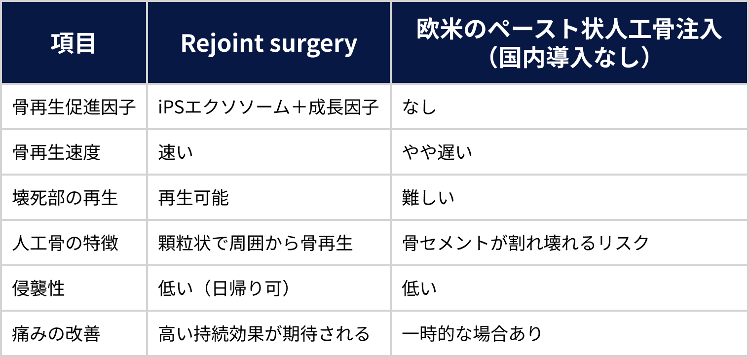 欧米では2010年代から大手医療機器メーカーがペースト状人工骨のみを投与する手法が紹介されていますが、骨壊死部や病変の大きさや状態によっては不十分で未だ、国内には導入されていません。
