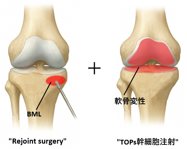 Rejoint surgery + はBMLに対するRejoint surgery (イラスト左)と軟骨変性に対するTOPs幹細胞注射(イラスト右)の両方の治療を行うものです。関節を支える土台の修復と軟骨の幹細胞治療によって、骨関節の修復や機能改善が期待されます。