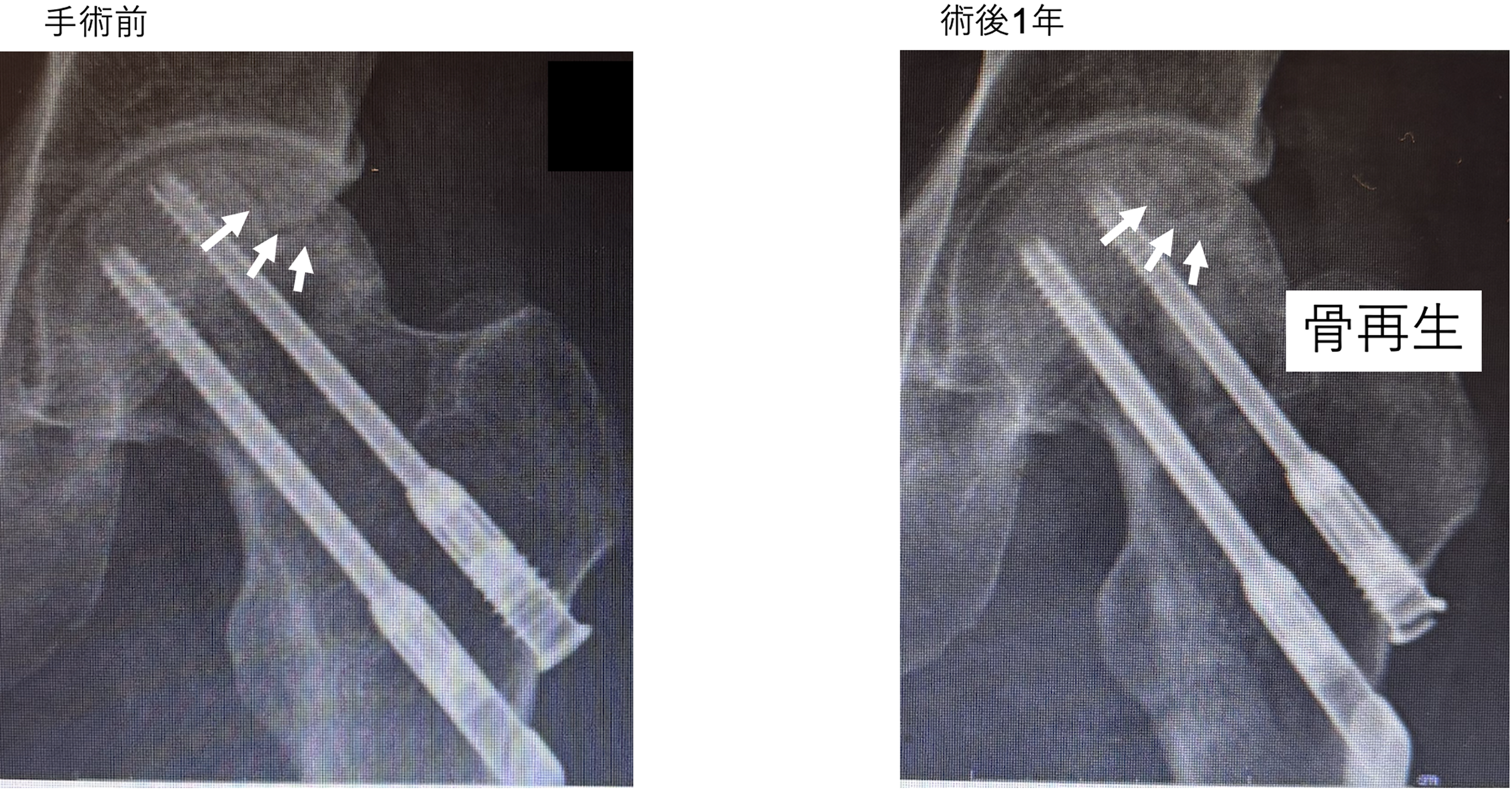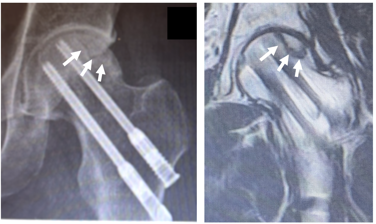 X線画像では骨折の治療の2本のスクリューがあり、その外側の体重がかかる部分にヒビが入ってきていて、MRIでも骨頭壊死と診断