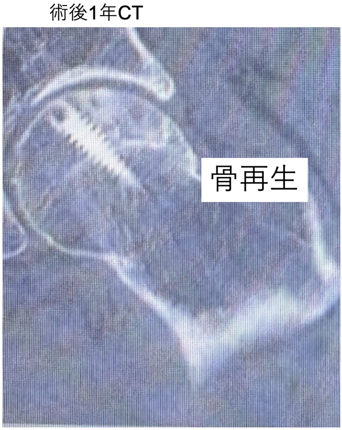 術後1年:ヒビが徐々に不明瞭 CTでも壊死部の骨再生を確認