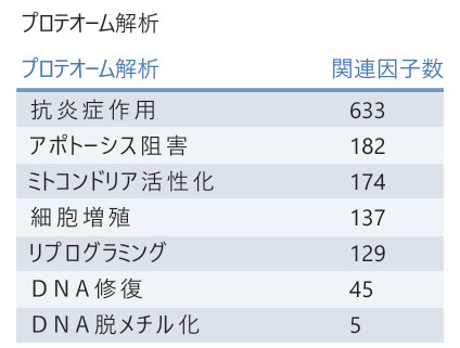 | 含有タンパク質 | 4000種類以上 | 633種類(抗炎症)、182種類(アポトーシス阻害)など |