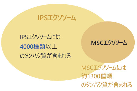 iPS細胞由来のエクソソームは、細胞の老化を遅らせるなどの効果が米国の論文で報告されており、一般的なMSC(幹細胞)エクソソームと比較して、より多くの種類のタンパク質(4000種類以上)を含んでいることがプロテオーム解析で確認されています。