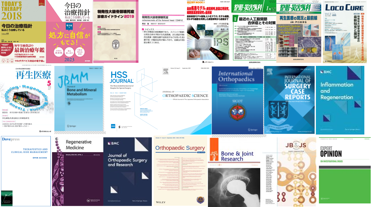 - 黒田隆ら. 特発性大腿骨頭壊死症 -世界で行われている再生医療、クリニカルトライアルの動向-. 第51回日本股関節学会学術集会.2024.10.25-26,岡山