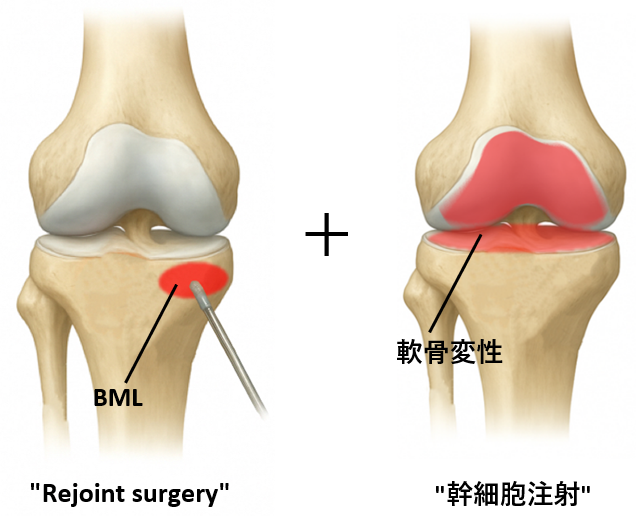 Rejoint surgery + はBMLに対するRejoint surgery (イラスト左)と軟骨変性に対する幹細胞注射(イラスト右)の両方の治療を行うものです。関節を支える土台の修復と軟骨の幹細胞治療によって、骨関節の修復や機能改善が期待されます。